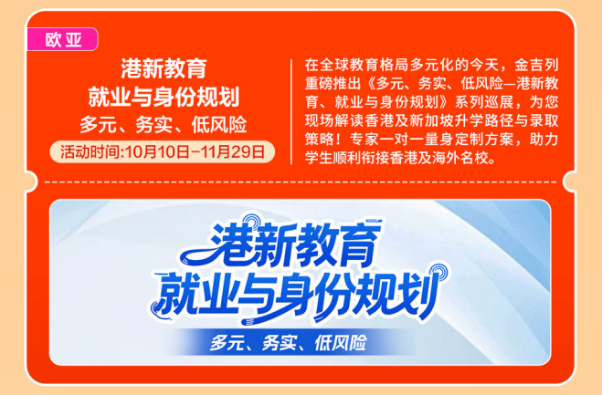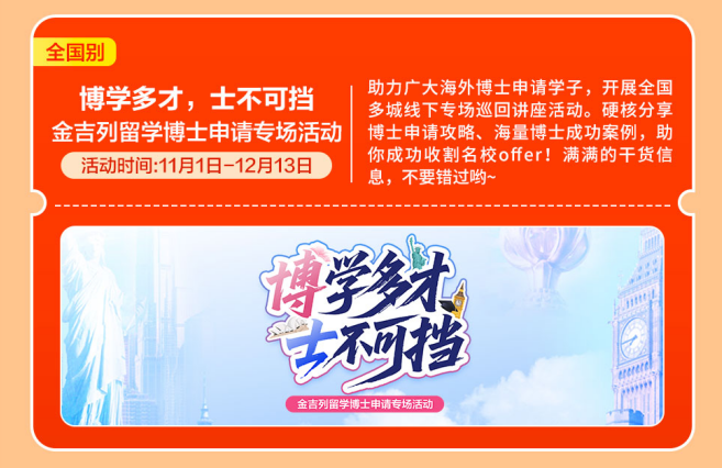 开展全国多城线下专场巡回勾当。金吉列留学做为留学行业的领军者,当即报名摸索属于你的大学之!让学生既获得名校登科,11月,