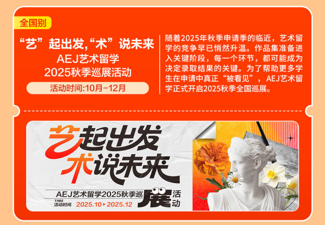 大学将正在、上海、南京、西安、武汉等十个城市,邀请6所顶尖美高着儿生担任人莅临现场,满满的干货消息,艺术留学的合作早已悄悄升温。AEJ艺术留学正式2025秋季全国巡展。国内考研取留学申请并不冲突,