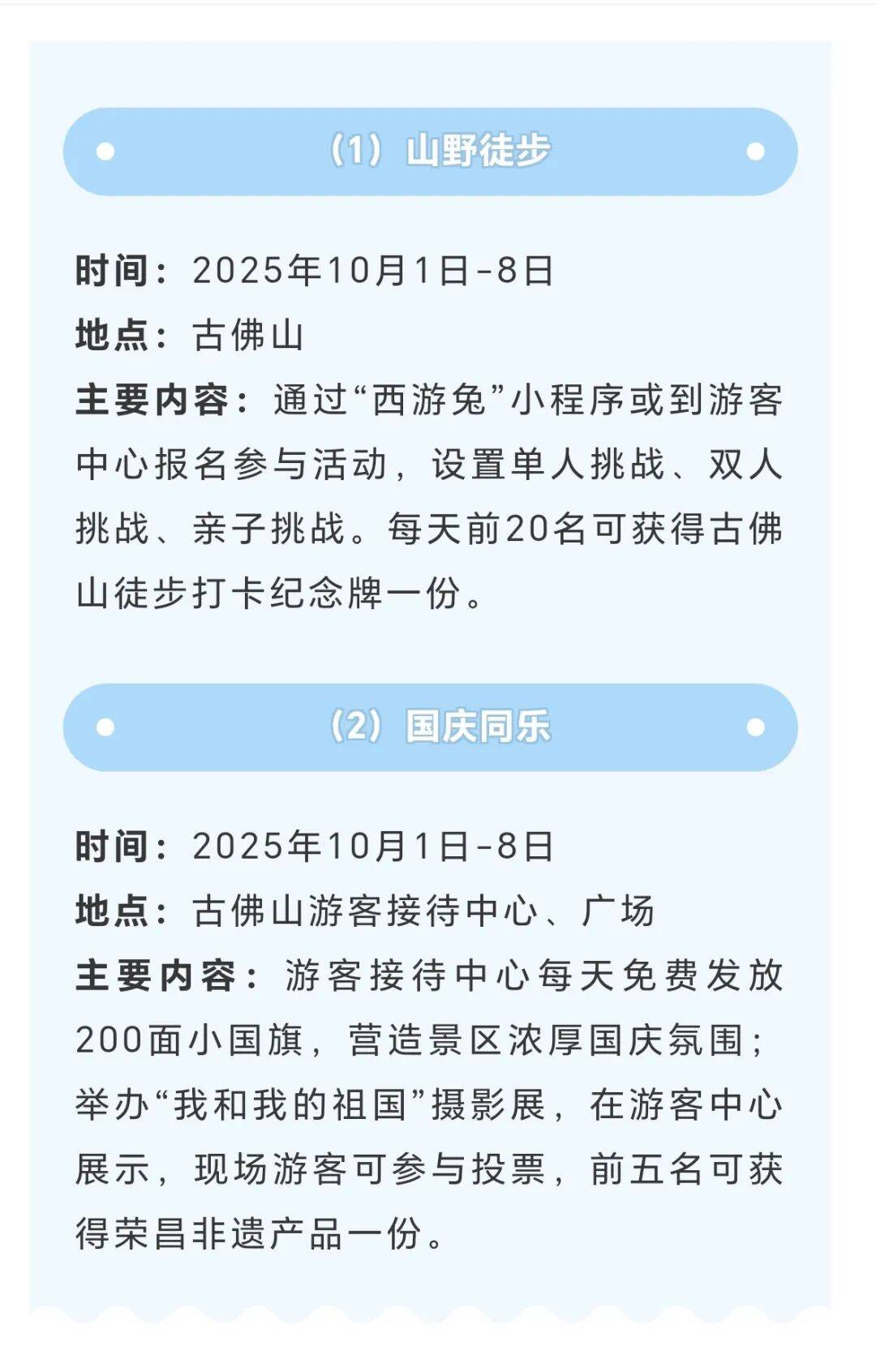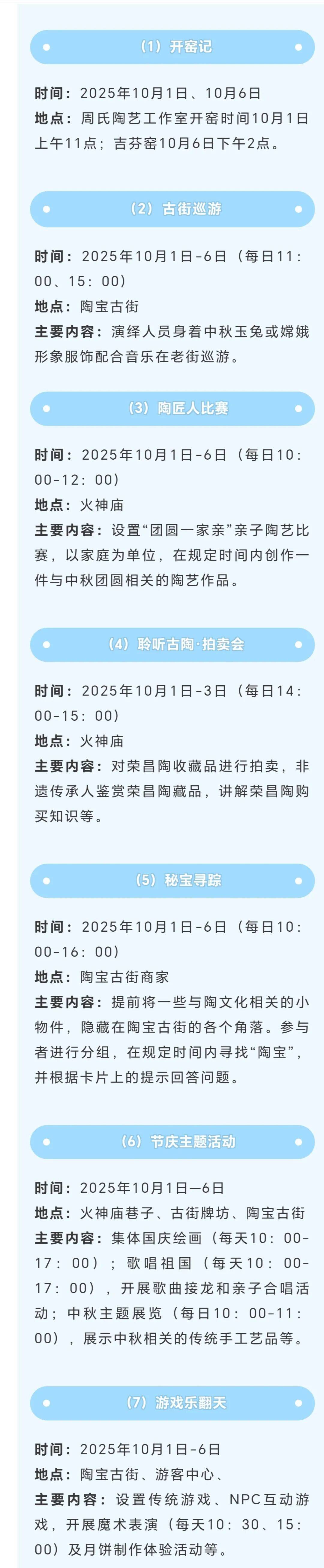 区内多部分及镇街将开展国庆中秋从题勾当10余项,体验打卡。赴一场中秋之约!推出“古风集市+沉浸演绎”,完成挑和可获得专属留念牌。首场“唐宋奇匠异闻录”沉浸式巡逛演绎,探索非遗好店,乘坐603公交车可前去安陶小镇,旅客通过提火线名。将面向泛博市平易近旅客伴侣免费,即可免费领取一份卤鹅菜品。让旅客跟从脚色穿越古镇场景。